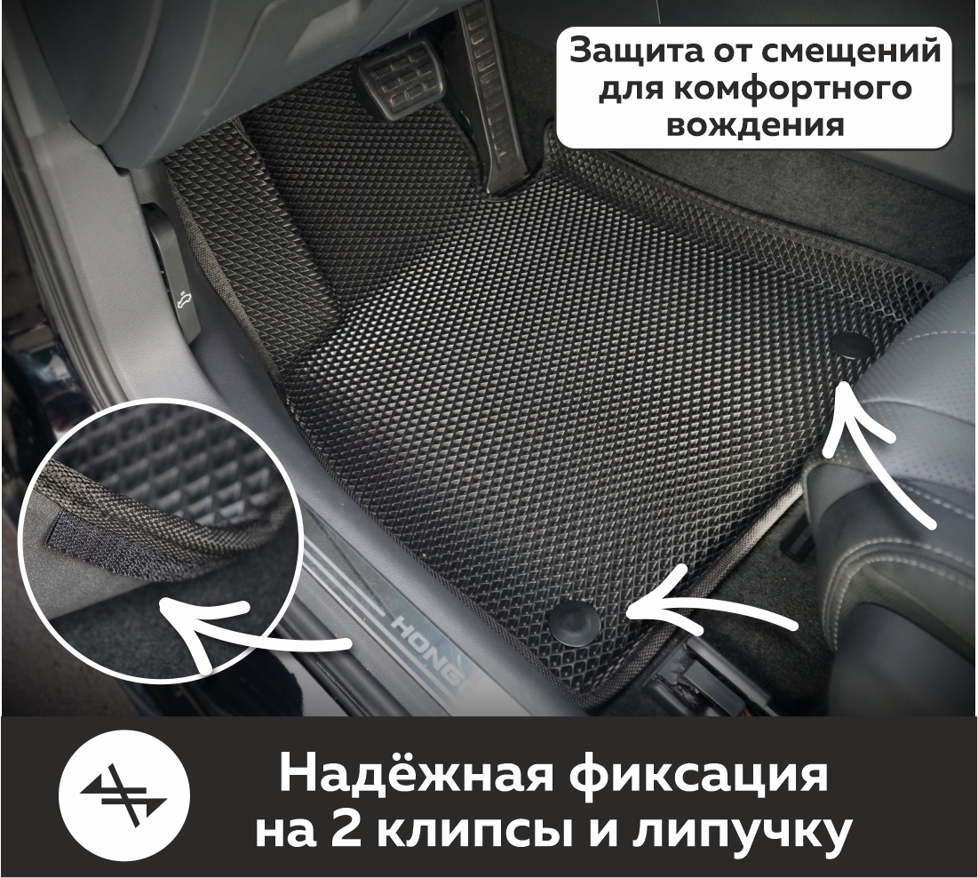 Коврики EVA надёжно крепятся с помощью оригинальных систем фиксации. Благодаря клипсам и липучке коврики защищены от смещений, что обеспечивает комфорт и безопасность вождения. Максимальное удобство также достигается точными, улучшенными лекалами для каждого автомобиля.