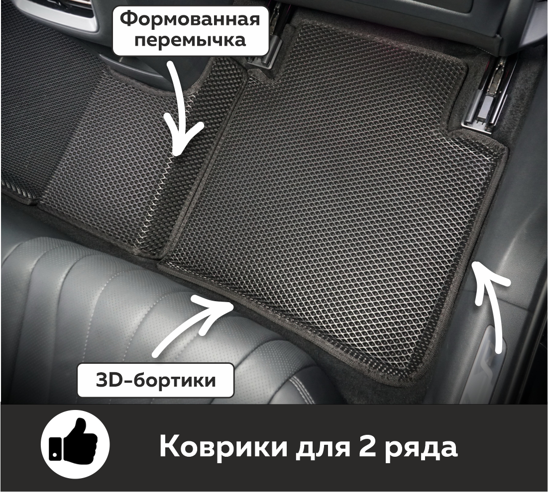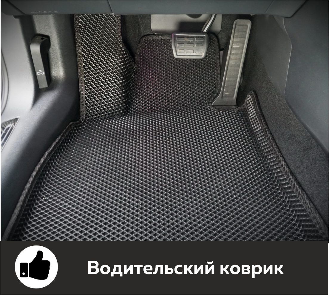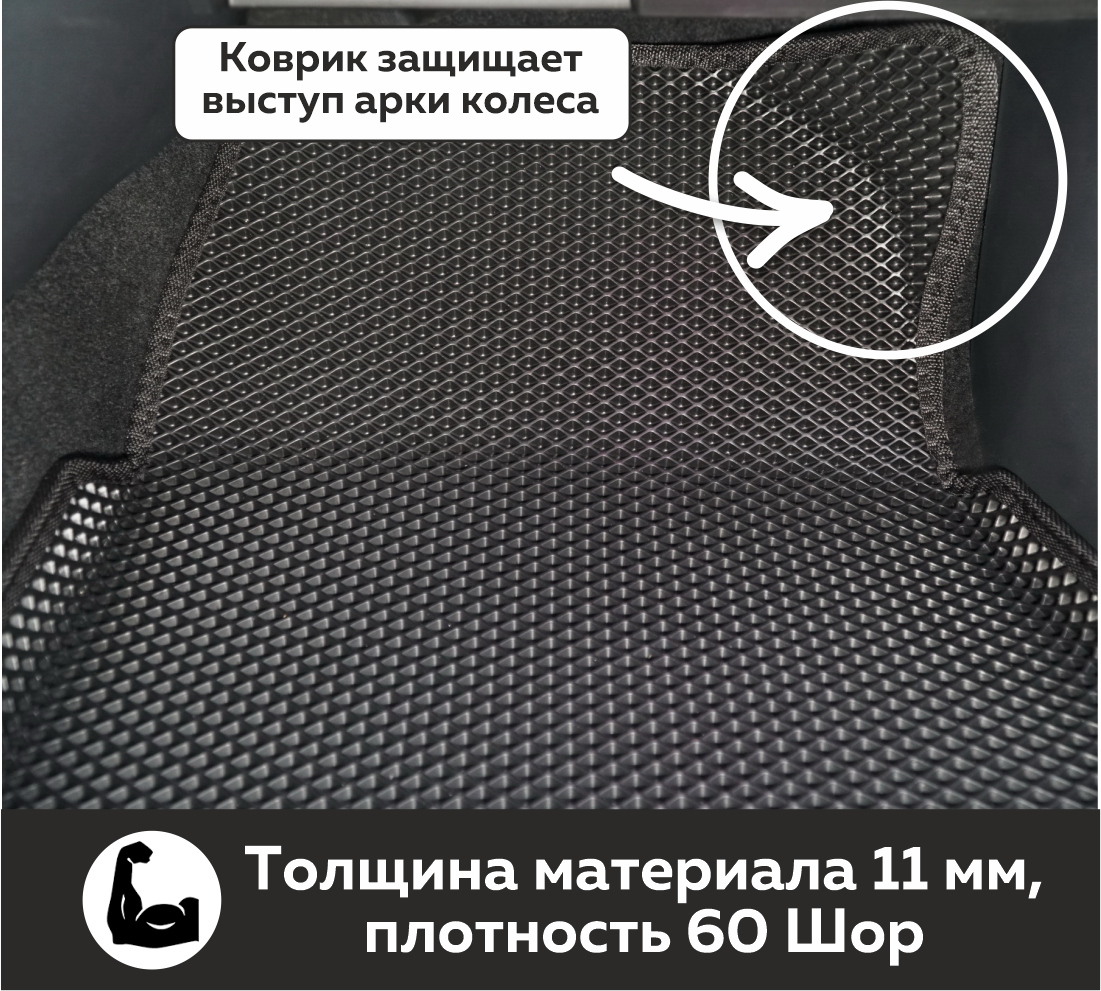 Толщина ковриков EVA составляет 10-12 мм. Глубина ячеек 7-8 мм. Такая толщина ковриков позволяет им служить довольно долго, не протираясь до 3 лет. А благодаря такой глубине ячеек коврик EVA площадью 1 кв.м. способен захватить около 3,5 л жидкости, сохраняя в чистоте вашу обувь и обивку салона.
