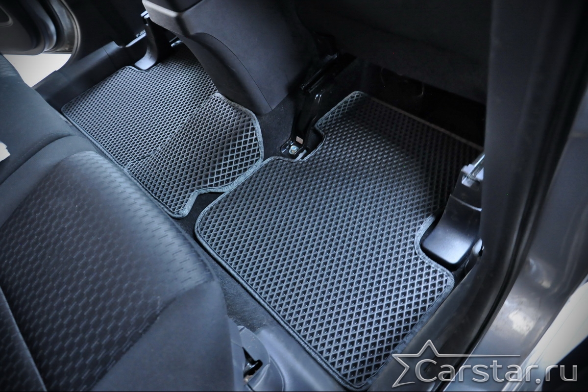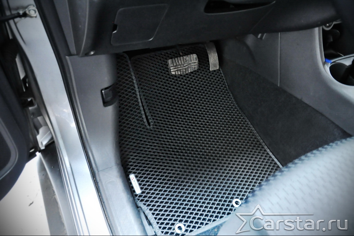 Толщина ковриков EVA составляет 10-12 мм. Глубина ячеек 7-8 мм. Такая толщина ковриков позволяет им служить довольно долго, не протираясь до 3 лет. А благодаря такой глубине ячеек коврик EVA площадью 1 кв.м. способен захватить около 3,5 л жидкости, сохраняя в чистоте вашу обувь и обивку салона.