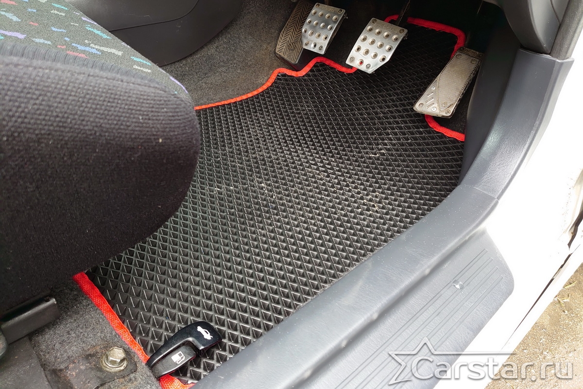 Толщина ковриков EVA составляет 10-12 мм. Глубина ячеек 7-8 мм. Такая толщина ковриков позволяет им служить довольно долго, не протираясь до 3 лет. А благодаря такой глубине ячеек коврик EVA площадью 1 кв.м. способен захватить около 3,5 л жидкости, сохраняя в чистоте вашу обувь и обивку салона.