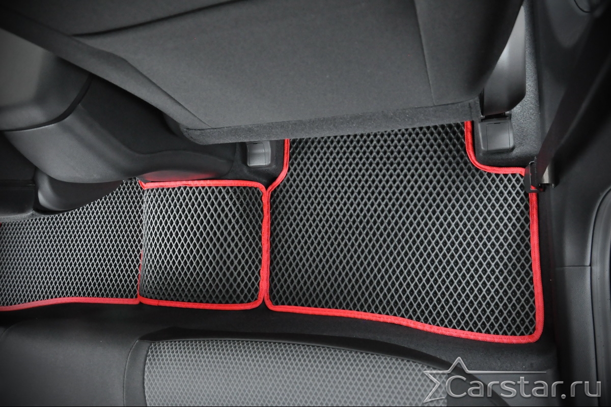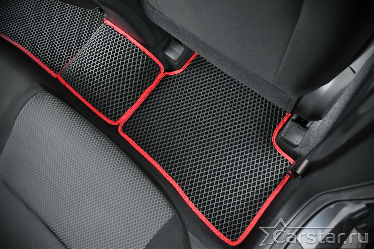 Текстильные коврики надёжно крепятся с помощью оригинальных систем фиксации. Обратная сторона имеет противоскользящее покрытие, что обеспечивает защиту от смещений и безопасность. Максимальное удобство достигается точными лекалами.