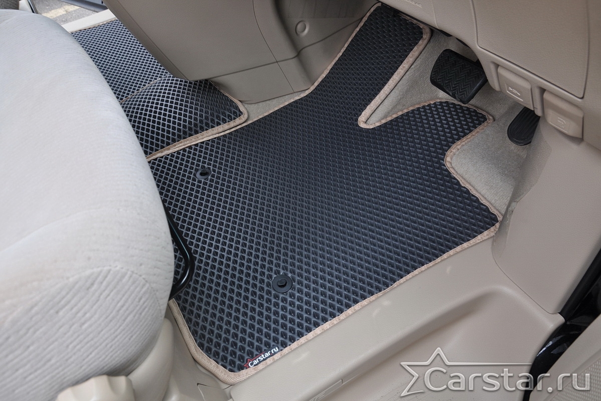 Текстильные коврики надёжно крепятся с помощью оригинальных систем фиксации. Обратная сторона имеет противоскользящее покрытие, что обеспечивает защиту от смещений и безопасность. Максимальное удобство достигается точными лекалами.